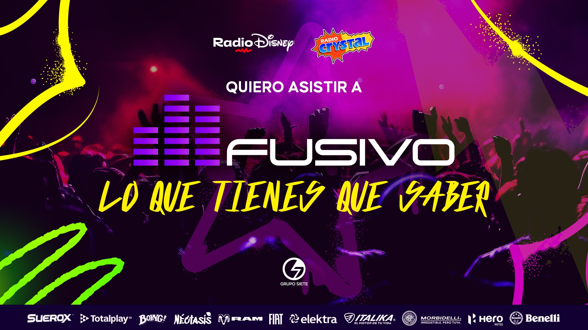 FUSIVO llega para celebrar la mezcla de géneros musicales en un ambiente 100% familiar donde, bajo el lema "aquí cabemos todos", se unen generaciones para vivir está fusión. ¿Lo mejor de todo? ¡La entrada es libre! El acceso es exclusivo para los fans más fieles de Radio Disney y Radio Crystal.